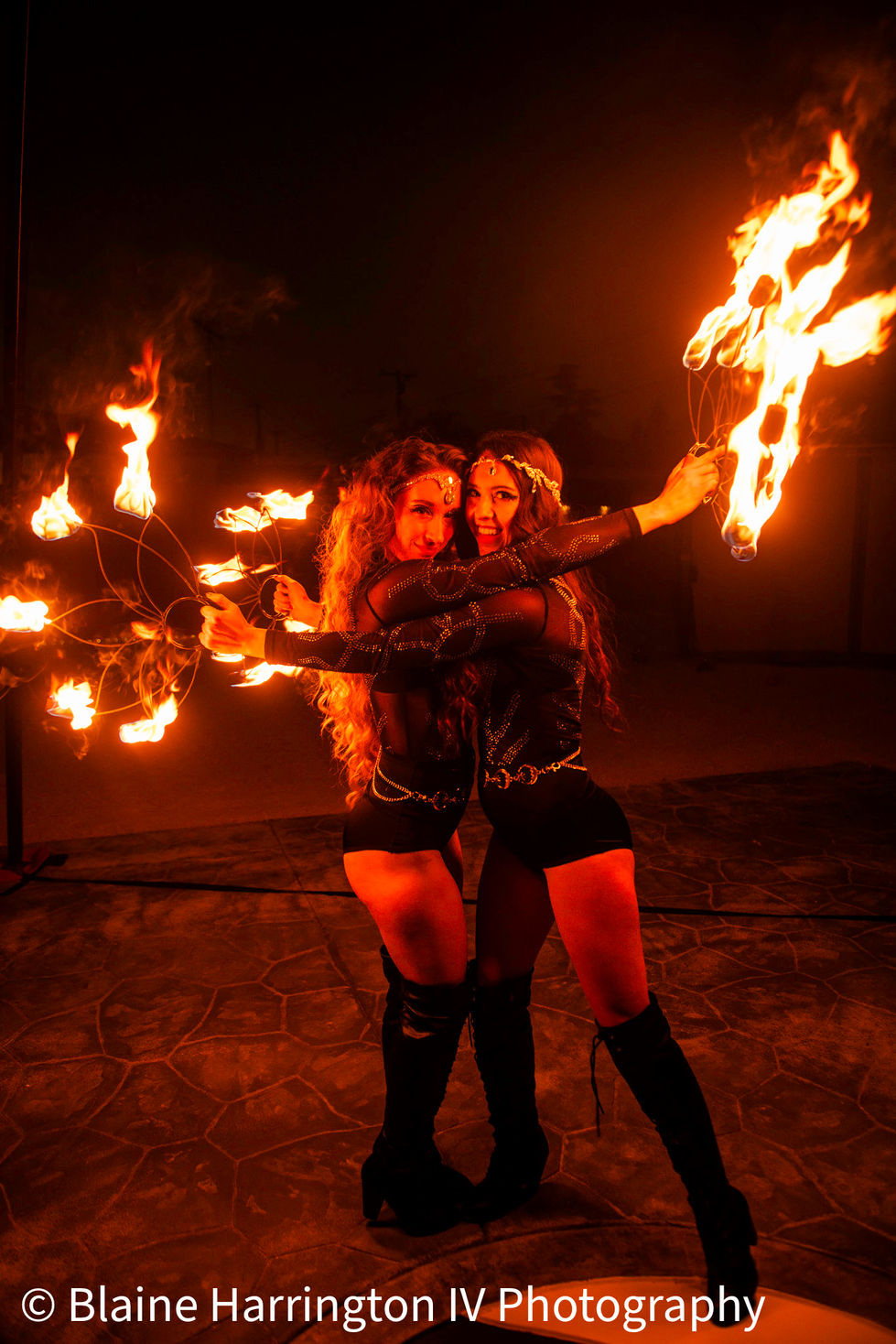 Aurora Starr and Jami Throne are professional fire dancers, and they were interested in collaborating with me on a photoshoot after seeing the work I had done of capturing Aurora's performance at a restaurant. We did the shoot in Aurora's backyard, and told them how I wanted to capture them and I gave them the freedom to do whatever. I trusted they knew what they were doing since they trained themselves to play with fire. We had a lot of fun doing this shoot and I'm pleased with the work we did.